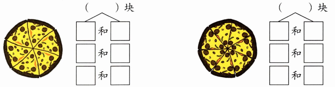 一、 把两个已经切开的比萨分别分成两组,可以怎样分,请你把各种方法记录下来。