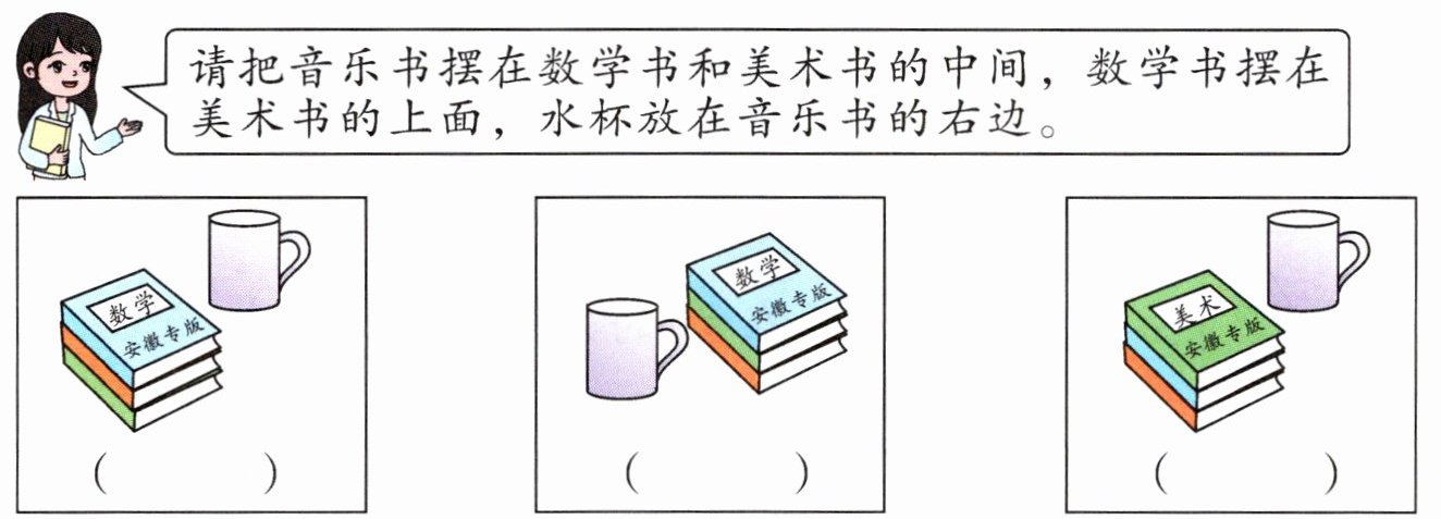 书和美术书的中间,数学书摆在美术书的上面,水杯放在音乐书的右边。