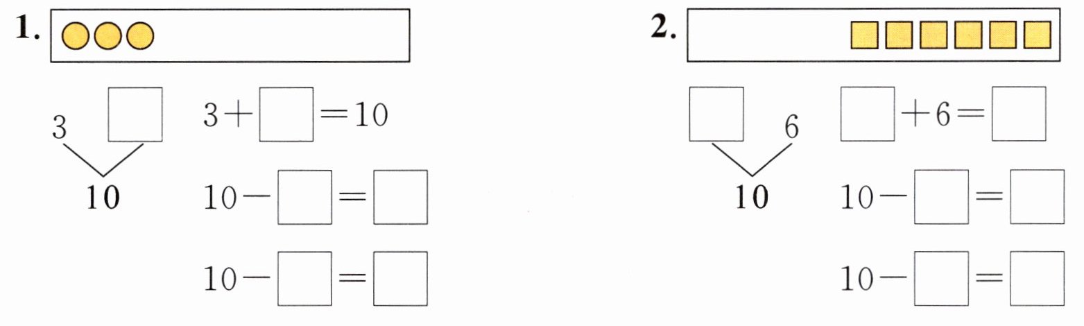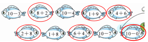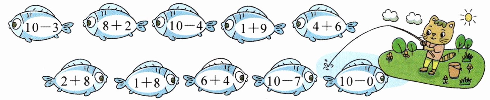 二、小猫钓到了下面得数是10的鱼,把它们圈起来。