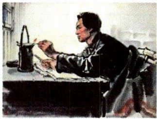 )着薄毯子,坐在竹椅上写文章。他右手(③