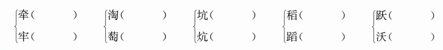 1. 牵手 牢固 2. 淘气 葡萄 3. 挖坑 火炕 4. 水稻 舞蹈 5. 跳跃 肥沃
