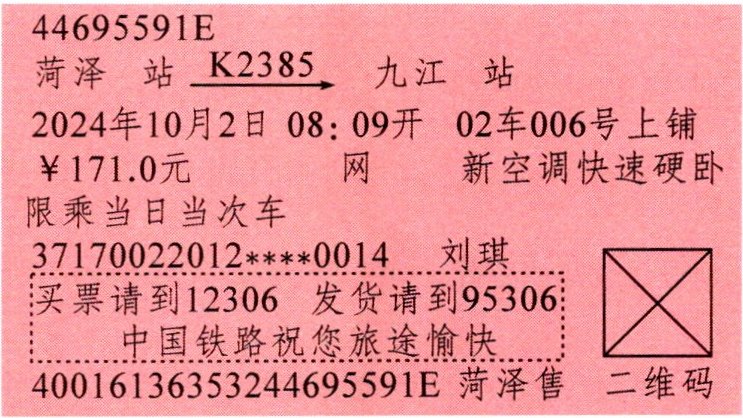 看了纪录片《跟着课本去旅行》,刘琪同学也想去看一看课本中位于江西省九江市的庐山的真面目,十一假期,他就和妈妈踏上了去往九江市的列车,开启了难忘的庐山之旅。(下图是刘琪的车票)。