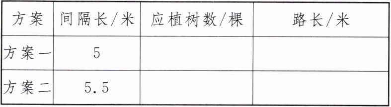 4. A|湖南师大附中校本经典题现有树苗若干棵,计划栽在一段公路的一侧,要求路的两端各栽1棵,并且每2棵树的间隔相等.方案一:若每隔5米栽1棵,则树苗缺21棵;方案二:若每隔5.5米栽1棵,则树苗正好用完.设原有树苗$x$棵,请根据题意,解答下列问题: