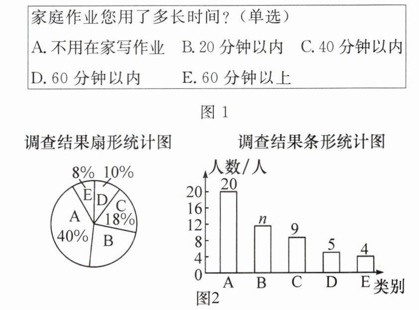 10. 随着双减政策的落实,同学们的家庭作业减少了。为了解同学们完成家庭作业需要的时间,某校数学兴趣小组随机调查了部分学生(问卷调查的内容如图1所示),并根据调查结果绘制了如图2所示的两幅统计图。
