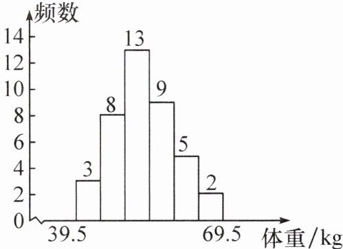 6. 某班40名学生体重的频数直方图(不完整)如图所示,组距为