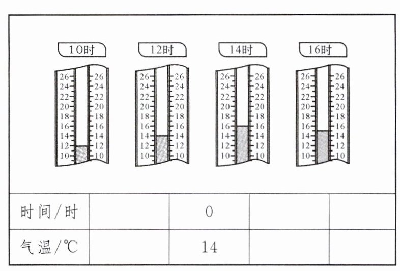 15. 杭州外国语校本经典题 某天 10 时、12 时、14 时、16 时的气温如图所示. 记 12 时的时间为 0,12 时以后的时间为正,请用正数和负数表示余下的三个时间及其气温,并填入下表.