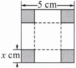 12. 如图,这是一张边长为 $5$ cm 的正方形纸片,将其四个角都剪去一个边长为 $x$ cm 的正方形,然后沿虚线折成一个无盖的长方体盒子,则这个盒子的容积为(