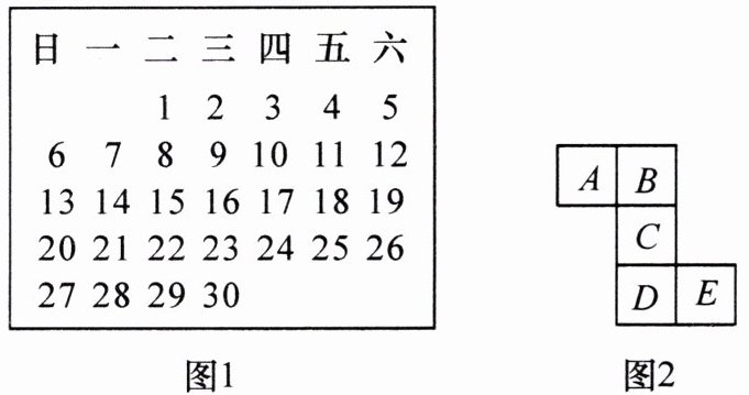 3. 如图 1,这是某年 11 月的月历,用如图 2 所示的“Z”字形覆盖住月历中的五个数,这五个数从小到大依次为$A$,$B$,$C$,$D$,$E$. 则这五个数的和能被 5 整除吗?为什么?