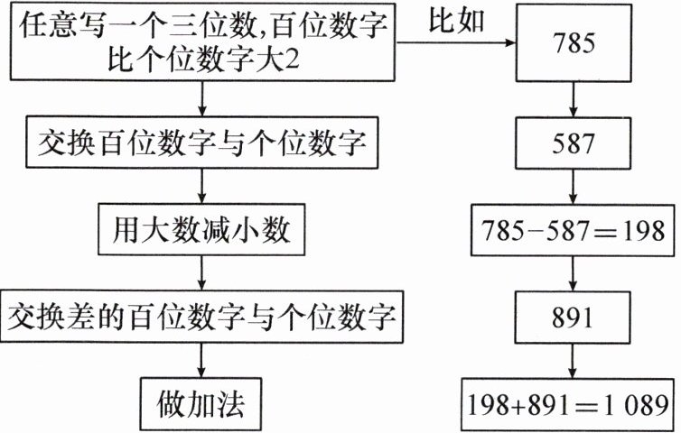解:举例不唯一,如:614-416=198,198+891=1089.发现:结果一定是1089.设百位数字为$a(2<a\leq9$,且$a$为整数),十位数字为$b$,则个位数字为$a-2$.该三位数为$100a+10b+a-2=101a+10b-2$,交换百位数字与个位数字后的三位数为$100(a-2)+10b+a=101a+10b-200$.$101a+10b-2-(101a+10b-200)=198$.$198+891=1089$.结果一定是1089.