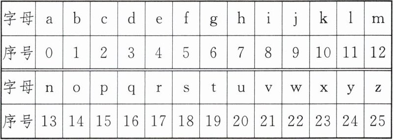 4. (教材 P99 习题 T4 变式)有一种密码,将 26 个英文字母 a,b,c,…,z 不论大小写依次对应 0,1,2,3,…,25 这 26 个自然数(如表格),当明码对应的序号$x$为奇数时,密码对应的序号为$\frac {x - 33}{2}$;当明码对应的序号$x$为偶数时,密码对应的序号为$\frac {x}{2}+5$.按上述规定,将明码“efuz”译成密码是______.