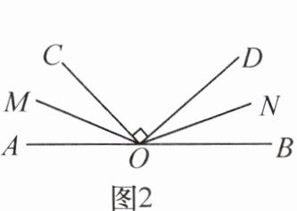 (2) 如图 2,直角 $ ∠COD $与平角 $ ∠AOB $按如图所示的方式摆放在一起,且 OM 和 ON 分别是 $ ∠AOC $,$ ∠BOD $的平分线,求 $ ∠MON $的度数.