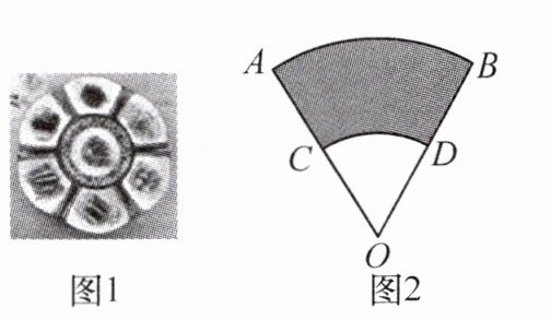 9. 新考向 真实情境 中国美食讲究色香味美,优雅的摆盘造型也会让美食锦上添花.图1中的摆盘,其形状是扇形的一部分,图2是其几何示意图(阴影部分为摆盘),通过测量得到OA = OB = 12 cm,OC = OD = 6 cm,∠COD = 60°,则图中摆盘的面积是