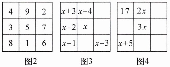 。(2) 设图 3 所示的三阶幻方中间的数为 $x$($x$ 为整数),请用含 $x$ 的代数式将图 3 幻方补充完整。