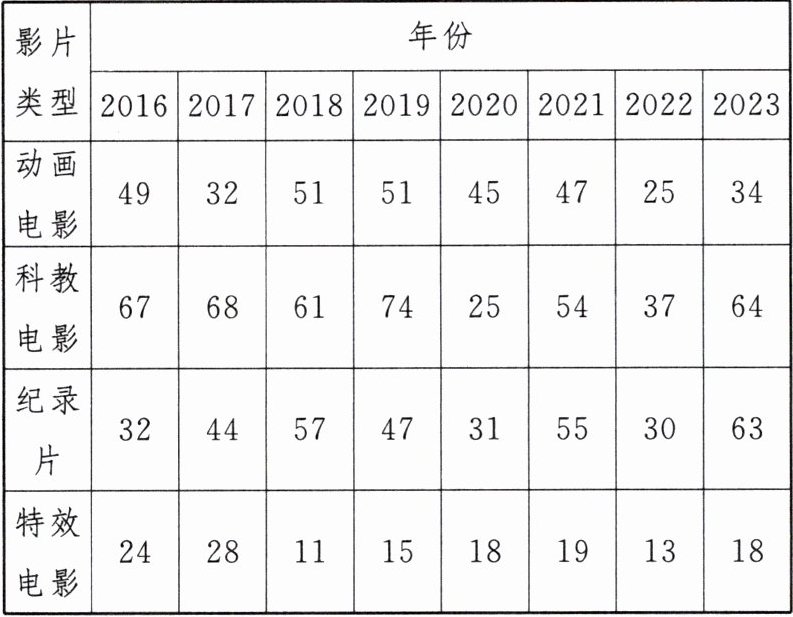 4. 下表统计了2016年至2023年四种类型电影的生产量.