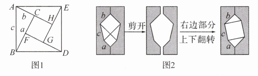 赵爽利用 4 个全等的直角三角形拼成如图 1 所示的“弦图”(史称“赵爽弦图”),其中 $ a $,$ b $ 和 $ c $ 分别表示直角三角形的两直角边和斜边,四边形 $ ABDE $ 和四边形 $ CFGH $ 是正方形。