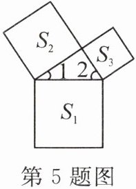 5. 如图,三个正方形的面积分别为 $ S_{1}=3 $,$ S_{2}=2 $,$ S_{3}=1 $,则分别以它们的一边为边围成的三角形中,$ ∠1+∠2= $