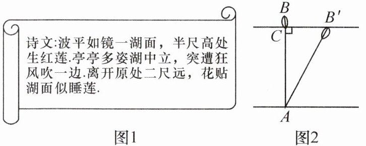 8. (2024·吉林)图 1 中有一首古算诗,根据诗中的描述可以计算出红莲所在位置的湖水深度,其示意图如图 2,其中 AB = AB',AB⊥B'C 于点 C,BC = 0.5 尺,B'C = 2 尺. 设 AC 的长度为 x 尺,可列方程为