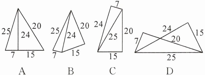 4. (教材 P14 随堂练习 T1 变式)有五根小木棒,其长度分别为 7,15,20,24,25,现将它们摆成两个直角三角形,其中正确的是(