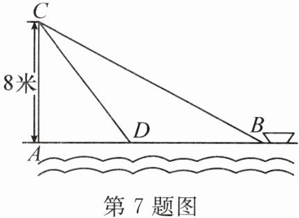 7. 如图,在离水面高度为 8 米的岸上,有人用绳子拉船靠岸,开始时绳子 BC 的长为 17 米,几分钟后船到达点 D 的位置,此时绳子 CD 的长为 10 米,则船向岸边移动了