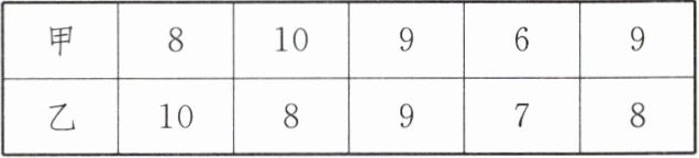 $(1)8 (2)x_{甲}=\frac{1}{5}×(8 + 10 + 9 + 6 + 9)=8.4,s_{甲}^{2}=\frac{1}{5}×[(8 - 8.4)^{2}+(10 - 8.4)^{2}+(9 - 8.4)^{2}+(6 - 8.4)^{2}+(9 -8.4)^{2}]=1.84.x_{乙}=\frac{1}{5}×(10 + 8 + 9 + 7 + 8)=8.4,s_{乙}^{2}=\frac{1}{5}×[(10 - 8.4)^{2}+(8 - 8.4)^{2}+(9 - 8.4)^{2}+(7 - 8.4)^{2}+(8 -8.4)^{2}]=1.04.\because s_{甲}^{2}>s_{乙}^{2},\therefore$乙队的成绩更稳定.