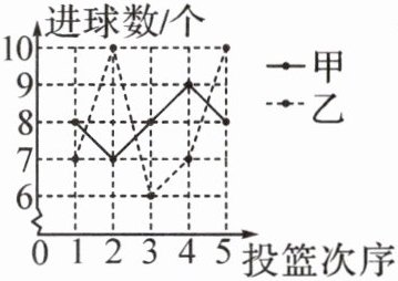 4. 如图,这是甲、乙两人5次投篮成绩统计图(每人每次投球10个),则对于方差的描述正确的是(
