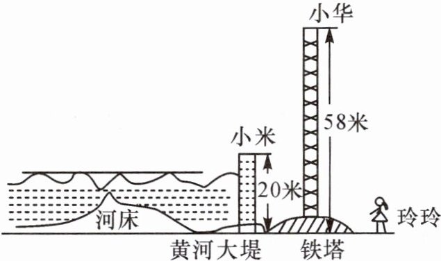 13.【真实问题情境】小米家住黄河边的某市,黄河大堤高出该市区20米,另有铁塔高约58米,是该市的一大景观,如图,小米和好朋友小华、玲玲出去玩,小米站在黄河大堤上,玲玲站在地面放风筝,顽皮的小华则爬上了铁塔顶,小米说:“以大堤为基准,记为0米,则玲玲所在位置高为-20米,小华所在位置高为+58米。”小华说:“以铁塔顶为基准,记为0米,则玲玲所在位置高为-58米,小米所在位置高为-38米。”玲玲说:“小华的位置比我高58米。”他们谁说得对?