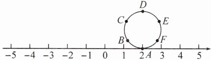14. 如图,周长为 $ 6 $ 个单位长度的圆上的六等分点分别为 $ A $,$ B $,$ C $,$ D $,$ E $,$ F $.如果点 $ A $ 落在数轴上 $ 2 $ 的位置,将圆沿数轴负方向滚动,那么落在数轴上 $ -2024 $ 的点是