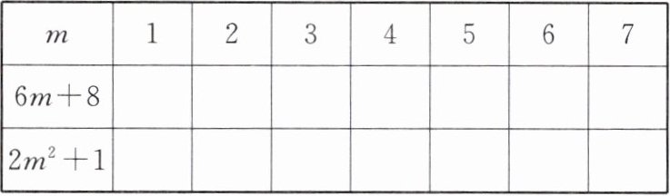 (1)把m的值分别代入6m+8及2m²+1,由表格内代数式的值的变化,得当m>0时,两个代数式的值都随m值的增大而增大.