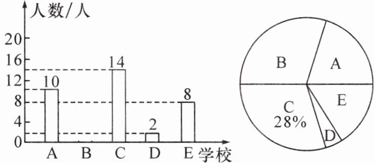 6. (菏泽单县期中)“基础学科拔尖学生培养试验计划”简称“珠峰计划”,是国家为回应“钱学森之问”而推出的一项人才培养计划,旨在培养中国自己的杰出人才.已知A,B,C,D,E五所大学设有数学学科拔尖学生培养基地,并开设了暑期夏令营活动,参加活动的每名中学生只能选择其中一所大学.某市为了解中学生的参与情况,随机抽取部分学生进行调查,并将统计数据整理后,绘制了如下不完整的条形统计图和扇形统计图.
