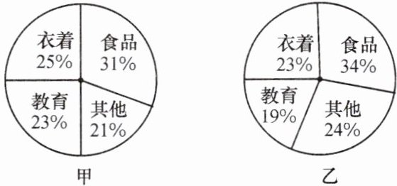 5. 如图所示的是甲、乙两户居民家庭全年支出费用的扇形统计图,根据统计图,下面对全年食品支出费用判断正确的是(