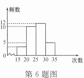 6. 某校为了解六年级学生的体能情况,随机抽查了其中30名学生,测试了1分钟仰卧起坐的次数,并绘制成如图所示的频数直方图(每组含前一个边界值,不含后一个边界值)。请根据图示计算仰卧起坐次数在15~20次之间的频数是