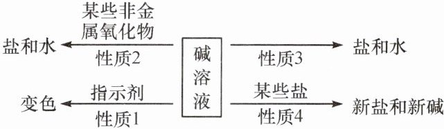 5. 归纳总结是学习化学的一种方法。请结合小明同学对碱的四点化学性质的归纳图回答下列问题。(箭头上方的物质是指与碱反应的物质)
