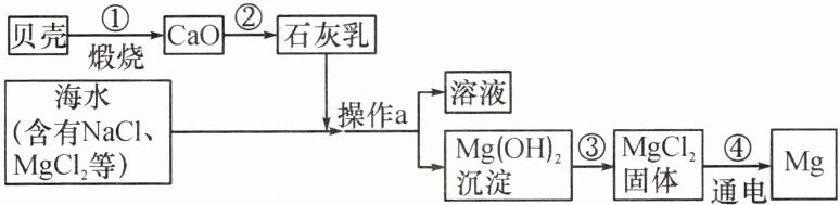 【解析】将溶液与氢氧化镁沉淀分离应采用过滤操作;过滤用到的主要玻璃仪器有烧杯、漏斗和玻璃棒;根据质量守恒定律可知另一生成物为 Cl₂,注意气体符号不能漏;根据海水制镁的流程可知①是碳酸钙高温分解的反应,③为氢氧化镁和盐酸的反应,正确写出这两个方程式。