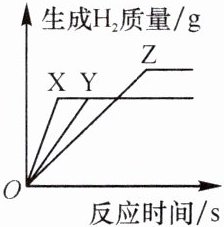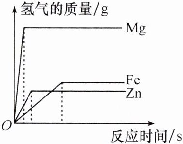 【解析】分别写出镁、铁、锌与盐酸反应的化学方程式,可知 $24$ 份质量的镁会生成 $2$ 份质量的氢气,$56$ 份质量的铁会生成 $2$ 份质量的氢气,$65$ 份质量的锌会生成 $2$ 份质量的氢气,通过分析图象,比较等质量的三种金属产生氢气的质量并结合三种金属活动性顺序得出答案。