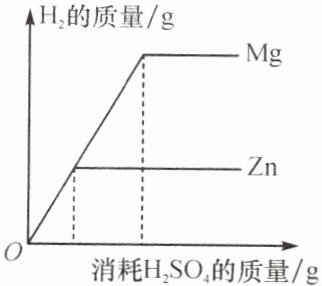 15. 在两只烧杯中分别放入相同质量的镁、锌两种金属,然后向两只烧杯中分别倒入相同质量、相同浓度的稀硫酸,反应产生氢气的质量与消耗硫酸的质量关系如图所示。综合以上信息得到以下结论,其中合理的是(