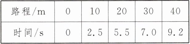 4. 某班同学用皮尺和停表测平均速度时,四位记时员分别记录了小明同学跑步通过 10 m、20 m、30 m、40 m 处所用的时间,如下表所示。