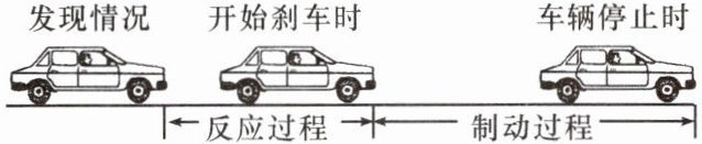 2. 汽车遇到意外情况时紧急停车要经历反应和制动两个过程,汽车在反应过程做匀速直线运动,在制动过程做变速直线运动。如图所示,若汽车以 72 km/h 的速度在平直公路上行驶,发现紧急情况停车时,在反应过程中汽车行驶了 14 m,制动过程所用的时间为 2.3 s。汽车在两个过程中通过的总距离为 30 m,求: