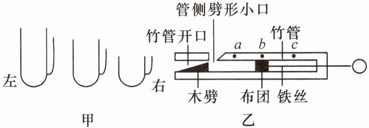 (2)小名根据实验,在课余时间制作了一个竹笛,如图乙所示。在竹管开口处向管内吹气,并推拉铁丝环使布团处在不同位置,改变音调,吹奏歌曲。则当布团分别位于a、b、c三个位置时,竹笛发声音调最高的位置是
