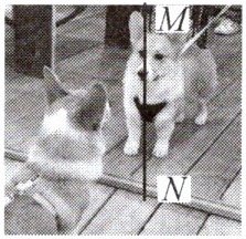 8. 宠物狗正前方竖立着一面镜子,它正在欣赏镜中的自己(如图所示),假设宠物狗不动,把平面镜沿 MN 截成两半,并分别向两侧平移一段距离(两块镜面仍然在原镜面平面内),则宠物狗的头部通过左、右两面镜子(