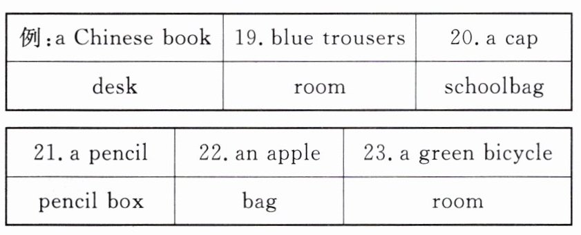 19. I have blue trousers in my room. 20. I have a cap in my schoolbag. 21. I have a pencil in my pencil box. 22. I have an apple in my bag. 23. I have a green bicycle in my room.