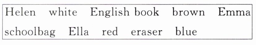 11. English book, schoolbag, eraser 12. white, brown, red, blue 13. Helen, Emma, Ella