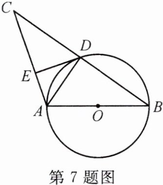 7. 如图,AB是⊙O的直径,⊙O交BC的中点于点D,DE⊥AC于点E,连接AD,则下列结论中正确的有(