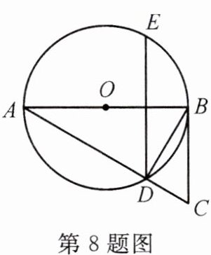 8. 如图,在△ABC中,∠BAC=28°,以AB为直径的⊙O交AC于点D,DE//CB,连接BD,若添加一个条件,使BC是⊙O的切线,则下列四个条件中不符合的是(