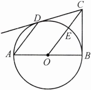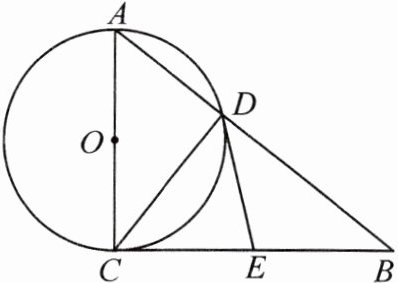 $\therefore \angle ADC = 90^{\circ}.\therefore \angle BDC = 90^{\circ}.\because$点$E$为$BC$的中点,$\therefore DE = CE = BE.\therefore \angle EDC = \angle ECD.\because OD = OC$,$\therefore \angle ODC = \angle OCD.\because \angle OCD + \angle DCE = \angle ACB = 90^{\circ}$,$\therefore \angle EDC + \angle ODC = 90^{\circ}$,即$\angle EDO = 90^{\circ}.\therefore DE \perp OD.\because OD$是$\odot O$的半径,$\therefore DE$与$\odot O$相切.