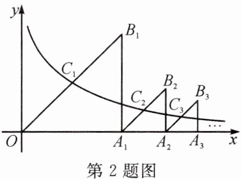 2. (淄博中考)如图,$ \triangle OA_{1}B_{1},\triangle A_{1}A_{2}B_{2},\triangle A_{2}A_{3}B_{3} \cdots $ 是分别以 $ A_{1},A_{2},A_{3} \cdots $ 为直角顶点,且一条直角边在 $ x $ 轴正半轴上的等腰直角三角形,其斜边的中点 $ C_{1}(x_{1},y_{1}),C_{2}(x_{2},y_{2}),C_{3}(x_{3},y_{3}) \cdots $ 均在反比例函数 $ y = \frac{4}{x}(x > 0) $ 的图象上,则 $ y_{1} + y_{2} + \cdots + y_{10} $ 的值为(