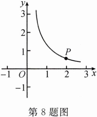 8. (泰安泰山区期中)如图,点 $ P $ 在反比例函数 $ y = \frac { 1 } { x } ( x > 0 ) $ 的图象上,且横坐标为 $ 2 $.若将点 $ P $ 先向右平移 $ 2 $ 个单位长度,再向上平移 $ 2 $ 个单位长度后得到点 $ P ^ { \prime } $,则经过点 $ P ^ { \prime } $ 的反比例函数图象的关系式是
