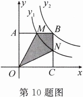 10. (日照中考)如图,矩形 $ O A B C $ 与反比例函数 $ y _ { 1 } = \frac { k _ { 1 } } { x } $ ($ k _ { 1 } $ 是非零常数,$ x > 0 $)的图象交于点 $ M $,$ N $,与反比例函数 $ y _ { 2 } = \frac { k _ { 2 } } { x } $ ($ k _ { 2 } $ 是非零常数,$ x > 0 $)的图象交于点 $ B $,连接 $ O M $,$ O N $.若四边形 $ O M B N $ 的面积为 $ 3 $,则 $ k _ { 1 } - k _ { 2 } = $