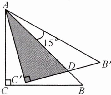 14.解:根据题意,得$AC' = AC = 1, \because \angle B'AB = 15^{\circ}, \therefore \angle BAC' = 45^{\circ} - 15^{\circ} = 30^{\circ}. \therefore C'D = AC' \cdot \tan 30^{\circ} = \frac{\sqrt{3}}{3}. \therefore S_{阴影} = \frac{1}{2} AC' \cdot C'D = \frac{1}{2} × 1 × \frac{\sqrt{3}}{3} = \frac{\sqrt{3}}{6}$.