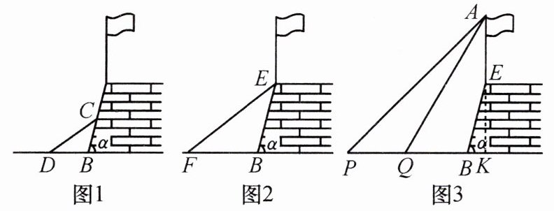 (3)如图3,第三小组利用第一、第二小组的结果,来测量护墙上旗杆的高度,在点P处测得旗杆顶端A的仰角为$45^{\circ}$,向前走4米到达Q点,测得A的仰角为$60^{\circ}$,求旗杆AE的高度。(结果精确到$0.1$米,参考数据:$\tan60^{\circ} \approx 1.732$,$\tan30^{\circ} \approx 0.577$,$\sqrt{3} \approx 1.732$,$\sqrt{2} \approx 1.414$)