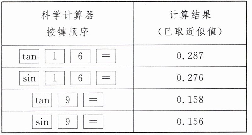 7. (淄博中考)如图,希望中学的教学楼AB和综合楼CD之间生长着一棵高度为$12.88$米的白杨树EF,且其底端点B,D,F在同一条直线上,$BF = FD = 40$米。在综合实践活动课上,小明打算借助这棵树的高度测算出综合楼的高度,他在教学楼顶A处测得点C的仰角为$9^{\circ}$,点E的俯角为$16^{\circ}$。问小明能否运用以上数据,得到综合楼的高度?若能,请求出其高度(结果精确到$0.01$米);若不能,说明理由。解答过程中可直接选用表格中的数据哟!